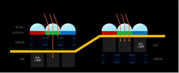在傳統(tǒng)的前照式CMOS傳感器中,光敏元件(像素)位于電路元件的后面,這意味著光線必須穿過電路層才能到達(dá)光敏元件,這限制了光的接收效率。而背照式CMOS傳感器的光敏元件位于電路的前面,使光線首先進(jìn)入感光二極管,從而有效增大感光量,提高在低光照條件下的拍攝效果傳感器的量子效率,這種設(shè)計(jì)減少了傳統(tǒng)CMOS傳感器中金屬線路和晶體管對光線的阻礙。