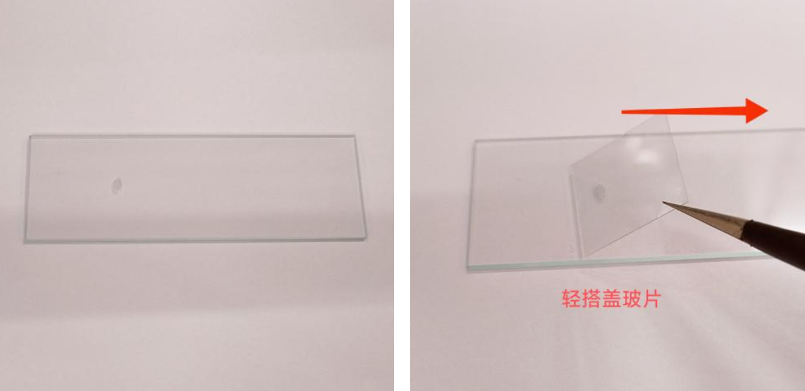 用鑷子持住蓋玻片的一端,輕輕地將另一端平整的抵在載玻片上,輕微用力快速把乳液推平,乳液的痕跡要求無(wú)劃痕,透光,透明,均勻?yàn)榧?。(或者存在這樣的區(qū)域即可)