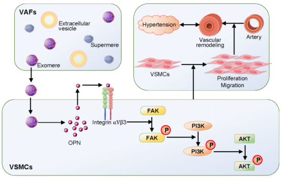 該團隊首次發(fā)現(xiàn),自發(fā)性高血壓大鼠的血管外膜成纖維細胞會釋放一類名為“外泌顆粒(exomeres, EMs)”的非囊泡性納米顆粒,通過轉(zhuǎn)運骨橋蛋白(osteopontin)激活下游整合素αVβ3/FAK/PI3K/AKT,從而促進血管平滑肌細胞(VSMCs)的增殖與遷移,加劇血管重構(gòu)和高血壓進程。