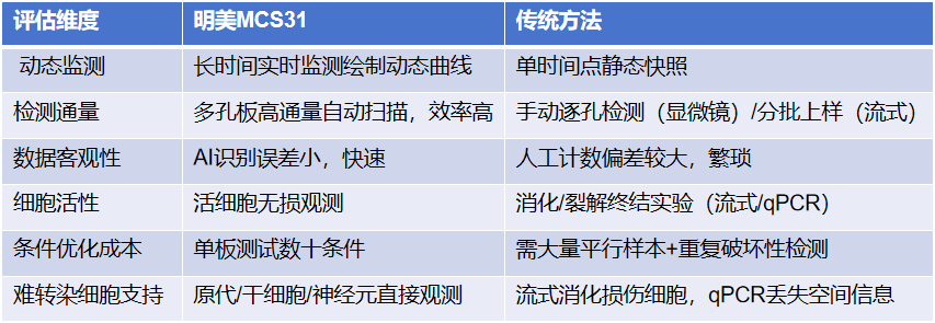 細(xì)胞在培養(yǎng)箱內(nèi)的狀態(tài)變化不可見(jiàn),實(shí)驗(yàn)人員只能被動(dòng)等待預(yù)設(shè)時(shí)間點(diǎn)進(jìn)行檢測(cè)。優(yōu)化轉(zhuǎn)染條件(DNA濃度、試劑比例、時(shí)間)需要設(shè)置大量平行樣本,在多個(gè)時(shí)間點(diǎn)進(jìn)行破壞性檢測(cè),消耗巨大的人力、物力和時(shí)間成本。效率、毒性、功能表型需獨(dú)立實(shí)驗(yàn),關(guān)聯(lián)性弱。固定/消化/染色嚴(yán)重干擾細(xì)胞狀態(tài),所得數(shù)據(jù)難以完全反映真實(shí)的生理情況。面對(duì)傳統(tǒng)方法的桎梏,明美活細(xì)胞掃描分析儀 MCS31應(yīng)運(yùn)而生。明美活細(xì)胞掃描分析儀MCS31將動(dòng)態(tài)成像、高通量掃描與AI分析深度融合,為轉(zhuǎn)染效率評(píng)估開(kāi)辟了全新的維度,實(shí)現(xiàn)了從“靜態(tài)終點(diǎn)盲測(cè)”到“動(dòng)態(tài)全程可視智能分析”的跨越。